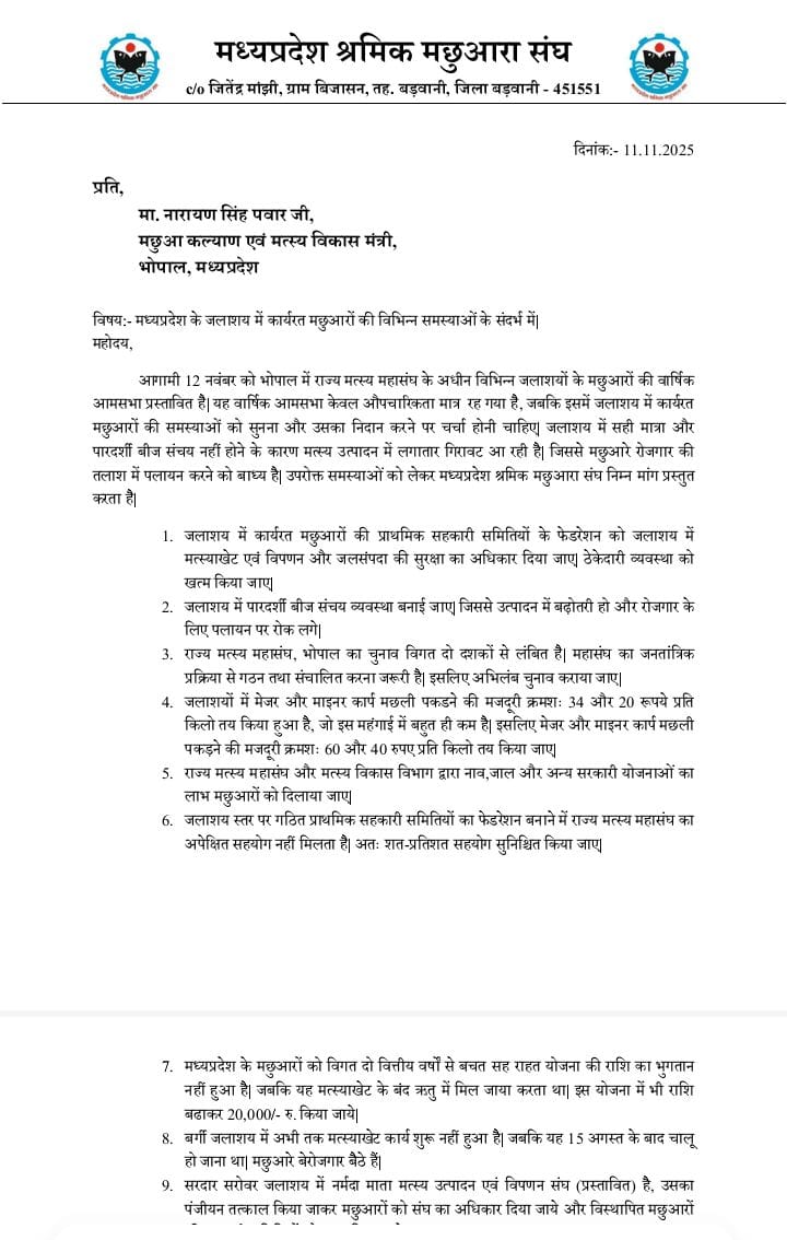 मध्यप्रदेश श्रमिक मछुआरा संघ का अधिवेशन 12 नवम्बर को होगा