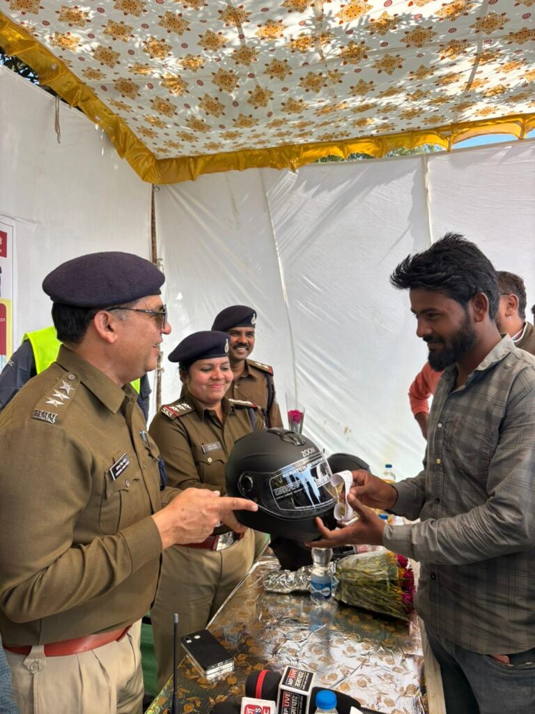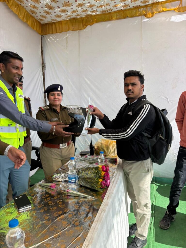 यातायात पुलिस से दुपहिया वाहन चालकों को मिला हेलमेट का उपहार