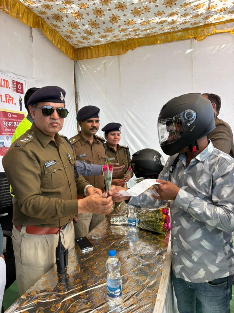 पुलिस ने पहले बिना हेलमेट वाले दुपहिया वाहन चालकों का चालान काटा । इसके बाद सभी को निःशुल्क हेलमेट एवं गुलाब का फूल देकर अनिवार्य रूप से हेलमेट पहनने हेतु प्रेरित किया गया । इस संबंध में पुलिस अधिकारियों ने दुपहिया वाहन चालकों को शपथ भी दिलाई ।