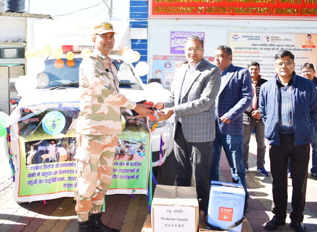 चमोली: वाइब्रेंट विलेज योजना के तहत चमोली जिले के सीमांत क्षेत्र में मवेशियों के बेहतर उपचार के लिए जिला प्रशासन ने नई पहल शुरु की है। प्रशासन की ओर से पशुपालन विभाग और भारत-तिब्बत सीमा पुलिस बल को वेटरनरी मेडिकेयर यूनिट वाहन उपलब्ध कराया गया है। जिलाधिकारी गौरव कुमार ने वाहन भारत-तिब्बत सीमा पुलिस बल को सौंपा।